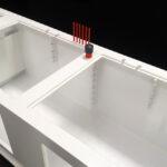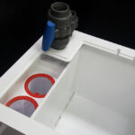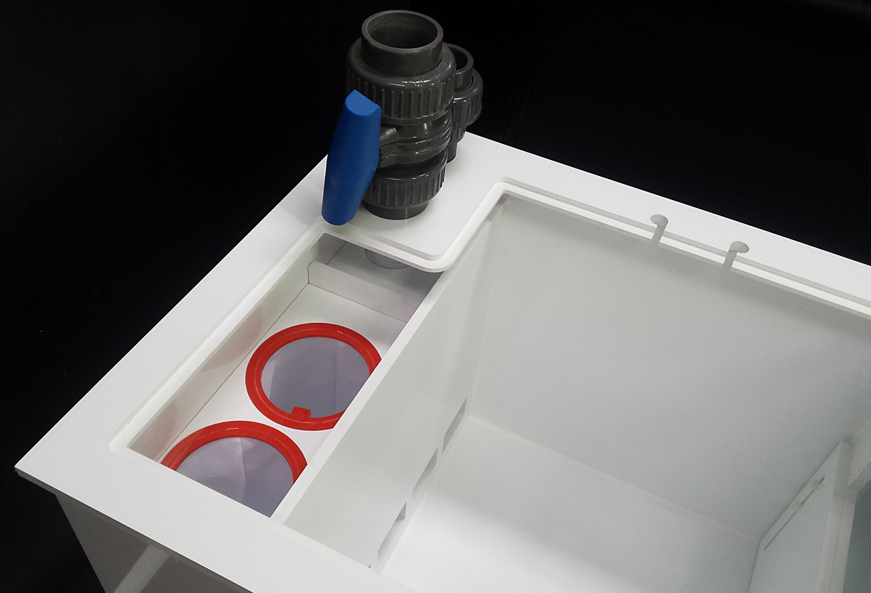 – komora zrzutu wody wyposażona jest w system wyciszający zintegrowany z uchwytem na dwie skarpety filtracyjne 10″ (całość można zdemontować)