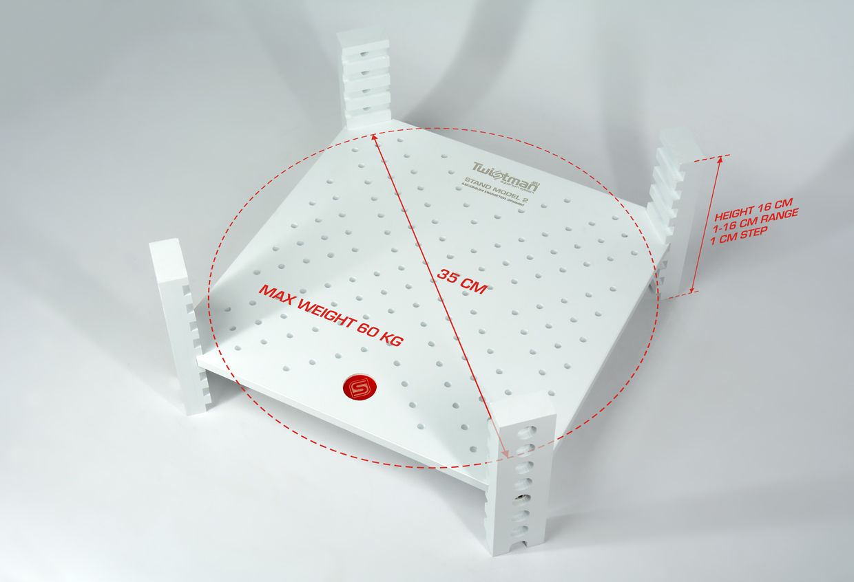 Wymiary: szerokość: 32cm: długość: 32cm; wysokość: 16 cm; Regulacja wysokości w zakresie: od 1 do 16 cm (co 1 cm) Maksymalne obciążenie: 60 kg.