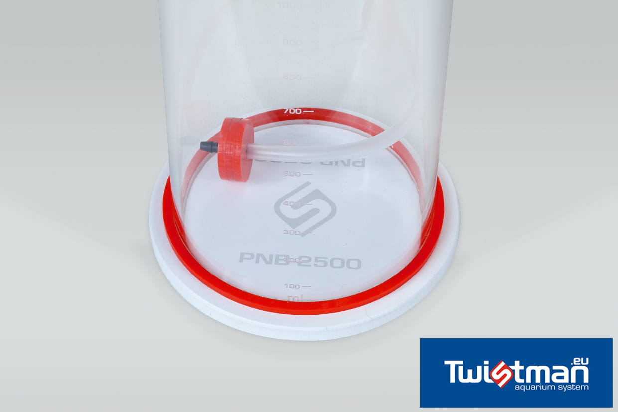 PNB-2500 posiada łatwe zamknięcie. Na deklu zamontowany został zaworek przeciwzwrotny ze standartowym przyłączem na wężyki silkonowe 6/4 mm lub podobne.